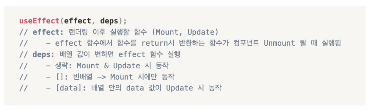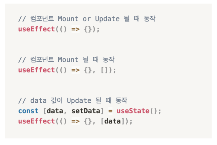 - 클래스형 component의 componentDidMount 함수와 componentDidUpdate 함수가 합쳐진 형태다.
