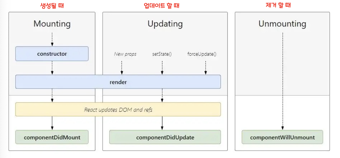 - Update (업데이트): props 및 state가 바뀌었을 때 업데이트함