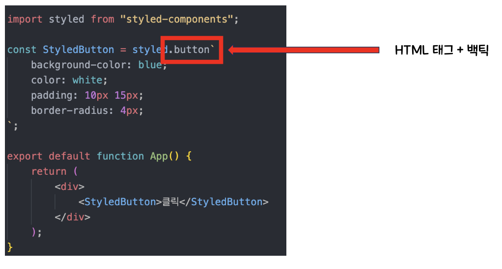 - styled.html태크 + 백틱 (``)으로 styled-component 생성을 할 수 있으며 백틱 사이에 일반 CSS 속성과 속성값들을 정의하여 사용할 수 있다.