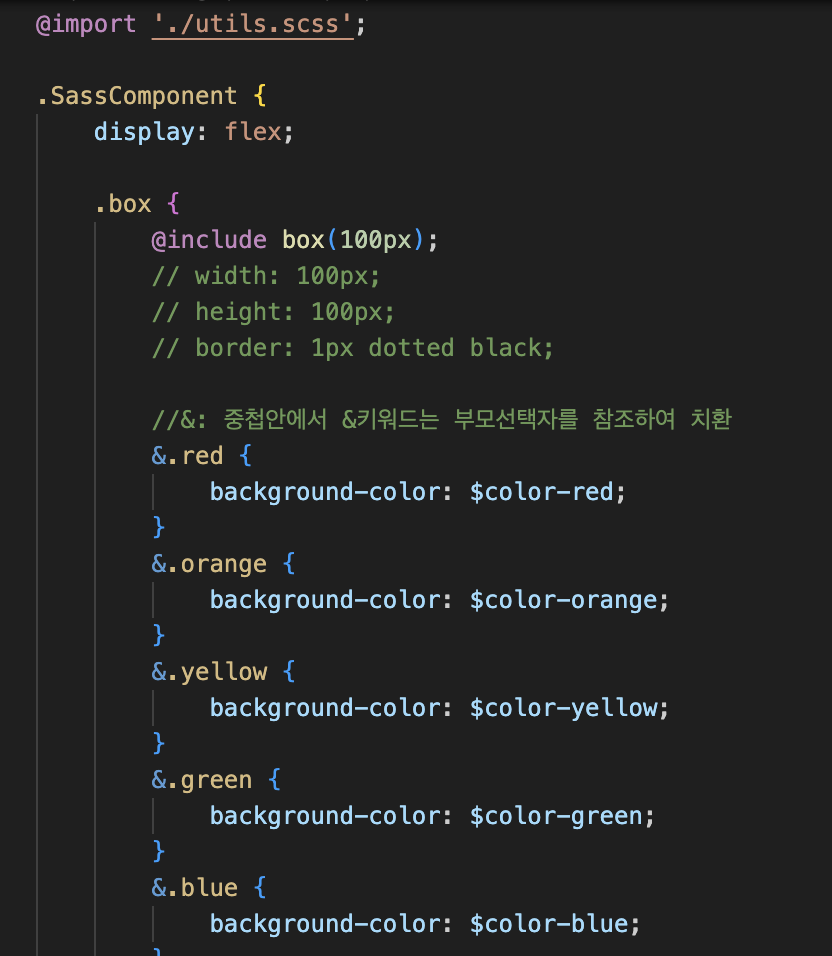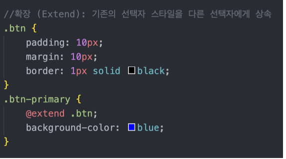- 기존에 다른 선택자에서 정의된 스타일을 상속받고 싶을 경우, @extend 뒤에 상속받고 싶은 선택자를 입력해 준다.